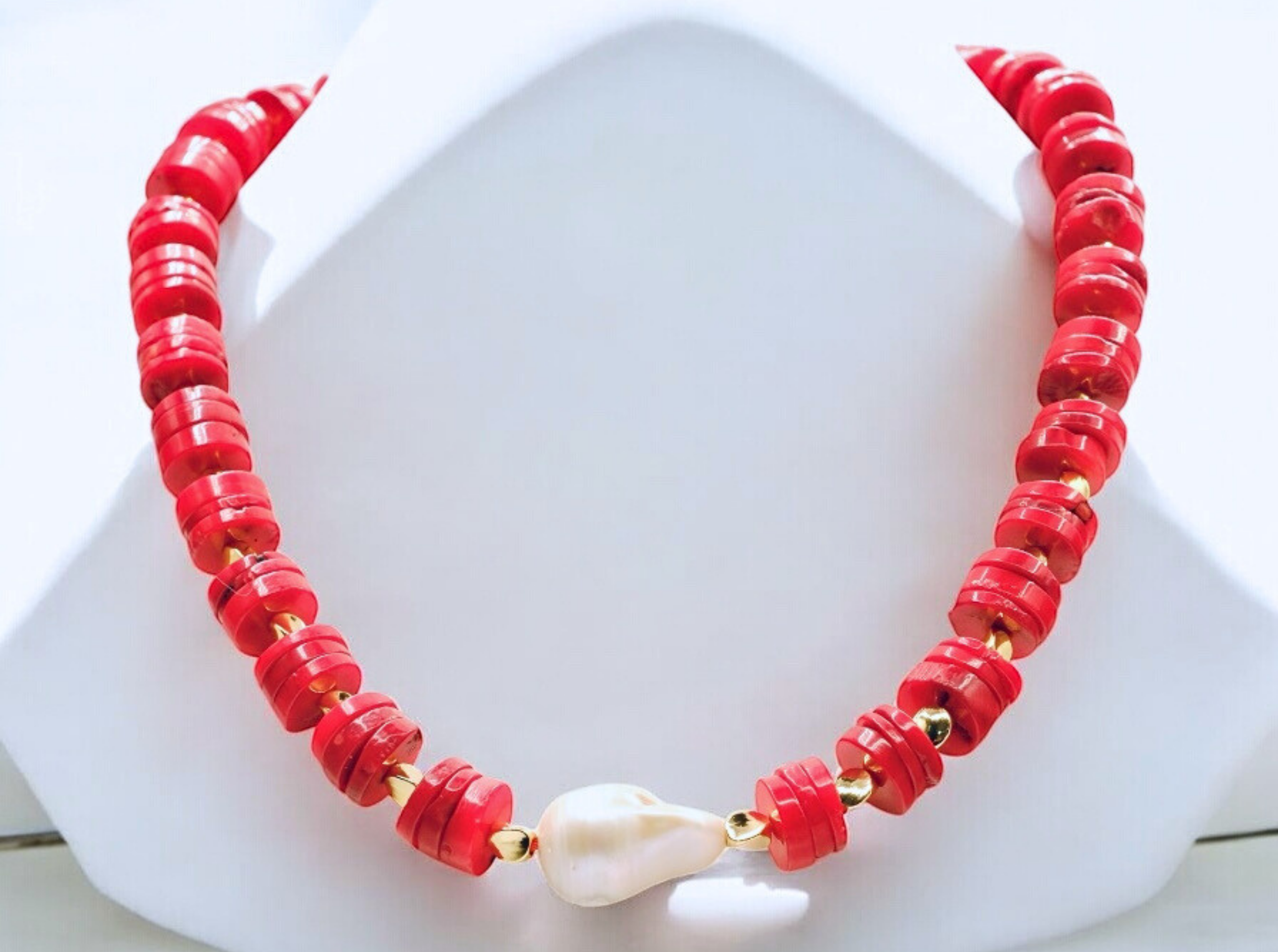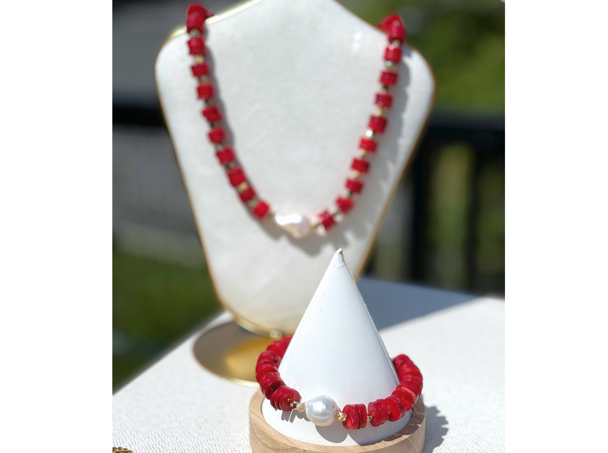 Crafted with care and intention, this limited-edition jewelry set features vivid natural red bamboo coral paired with a luminous baroque pearl — a combination as bold, elegant, and unforgettable as the woman you are celebrating.